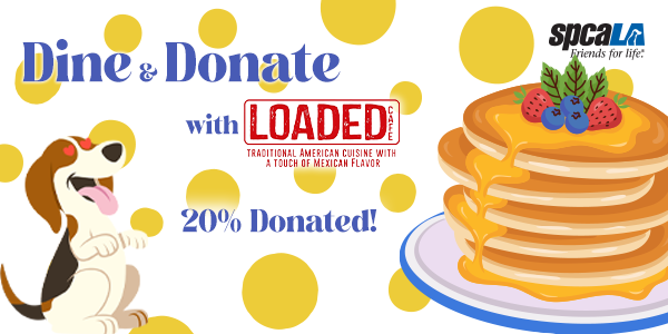 Celebrate 2023 with a Dine & Donate at Loaded Café! On January 23rd, mention spcaLA and they’ll donate 20% of your bill to spcaLA – no flyer needed! The fundraiser is good over the phone, online or dining in.