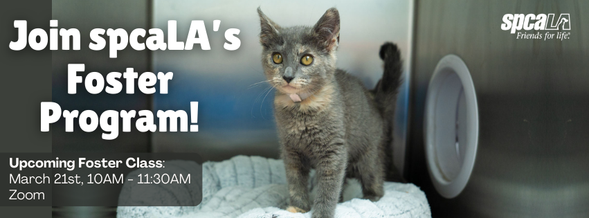 Are you interested in becoming a foster volunteer? We are hosting a training class on March 21st from 10am to 11:30am via Zoom. spcaLA covers all supplies and medical care and foster volunteers provide a home and TLC. Short and longer terms available. Application must be accepted prior to attending. Click here for more information and to submit an application.